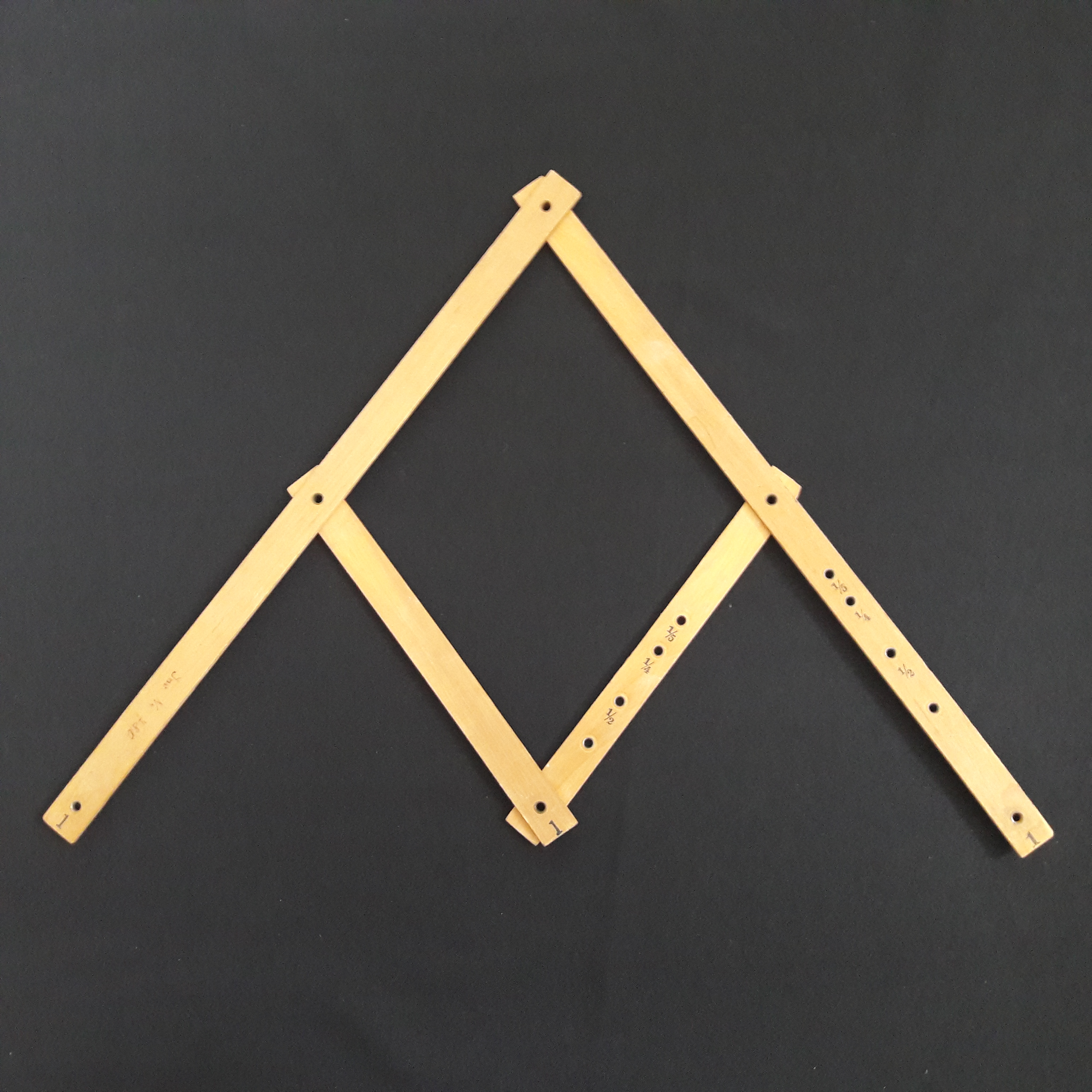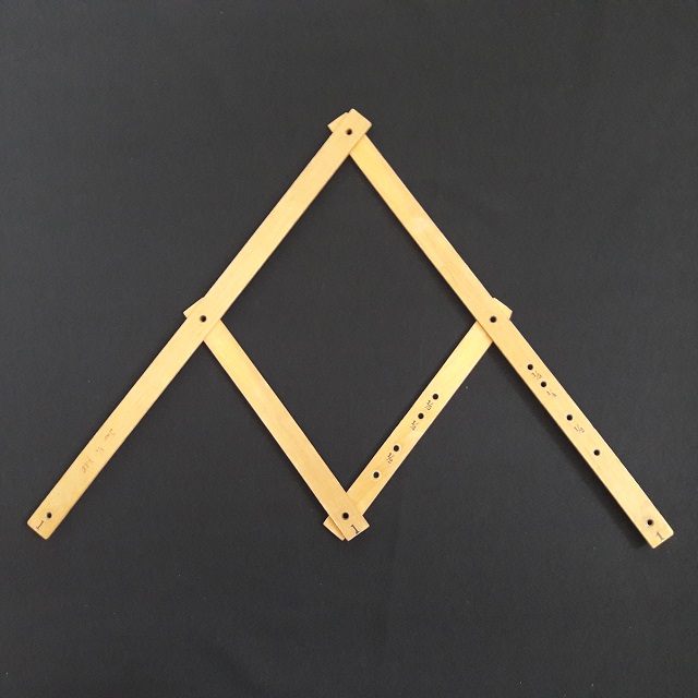 | Der Pantograph oder Storchschnabel, ist ein Spezialfall des Plagiographen von SYLVESTER und kann zur Reproduktion von Zeichnungen mit dergleichen, einer größeren oder einer kleineren Skalierung als das Original verwendet werden. |
