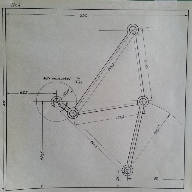 | Geschlossene angenäherte Geradführung nach TSCHEBYSCHEFF. Schmale Koppelkurve mit zwei dreifachen Tangenten. |