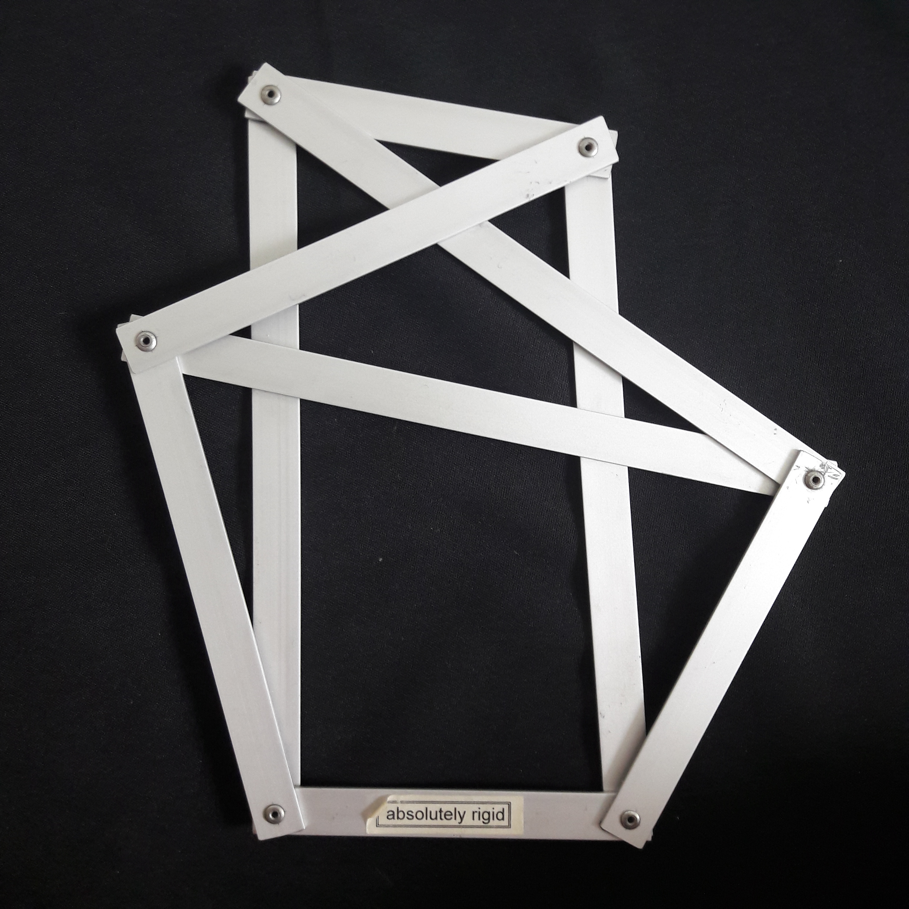 | Starres Neunstabgetriebe. Auf Grund von Gelenksspielräumen, die der nicht allzu hohen Präzision der Bohrungen und Nietung geschuldet sind, ist das eigentlich starre Modell etwas beweglich. |