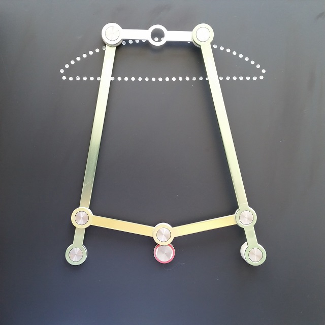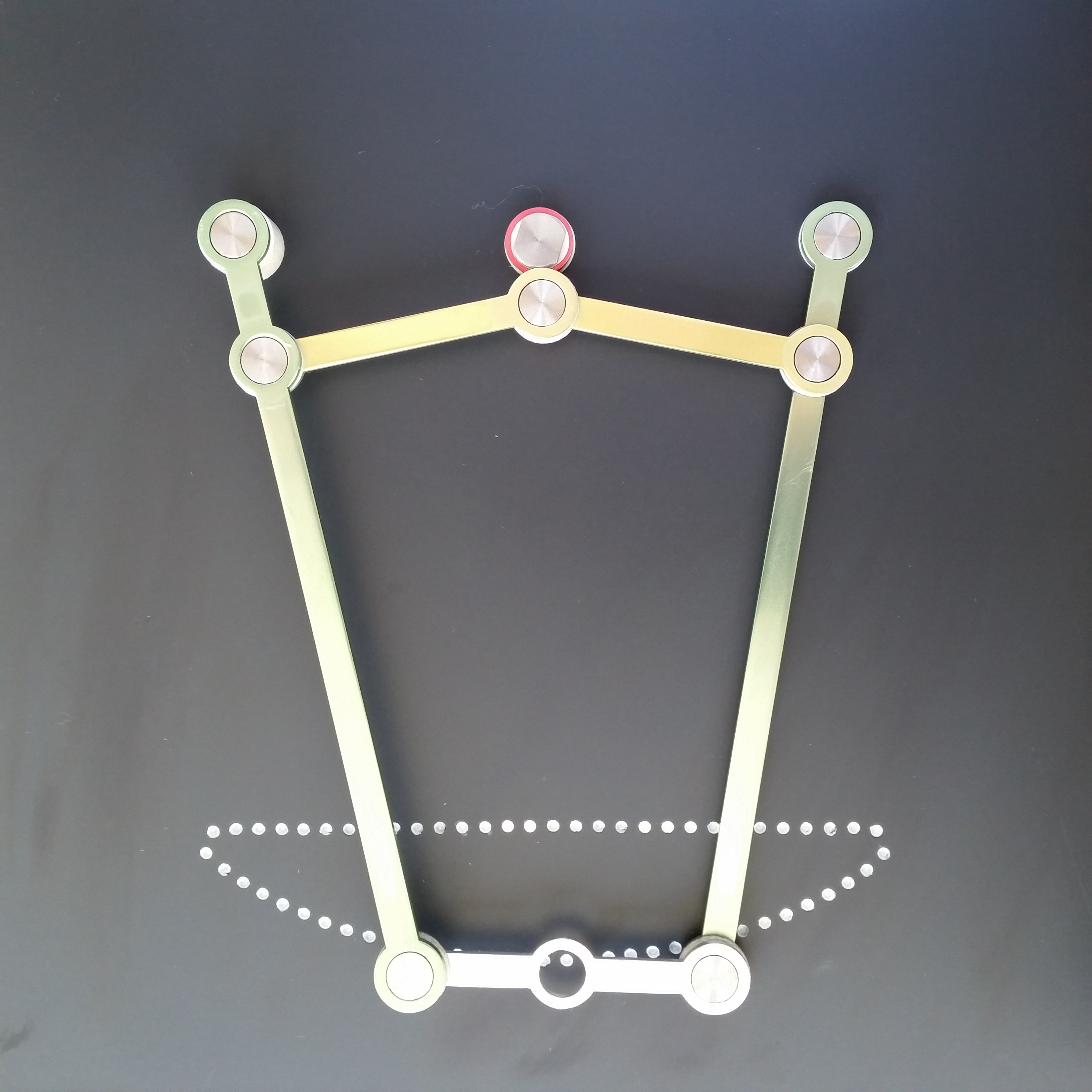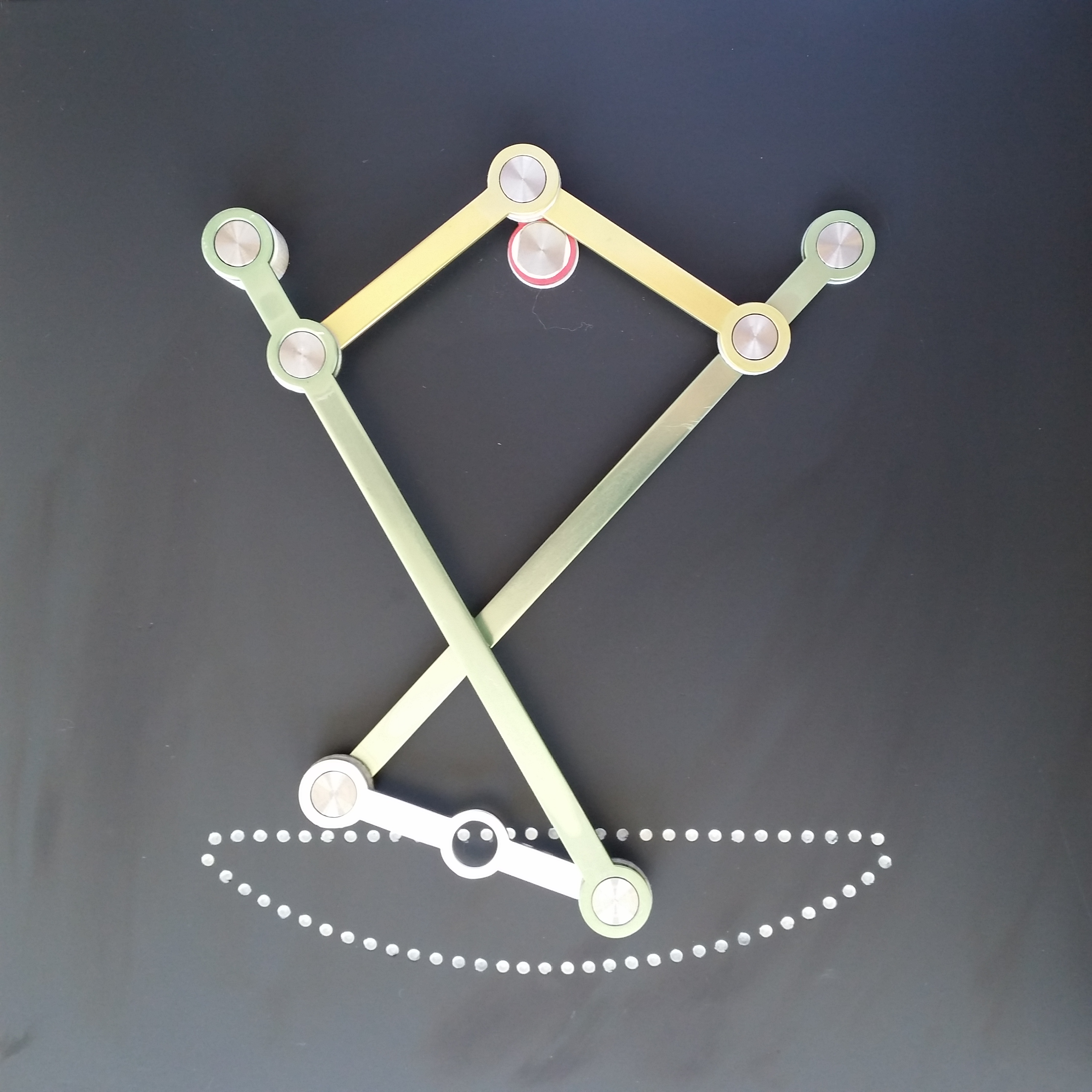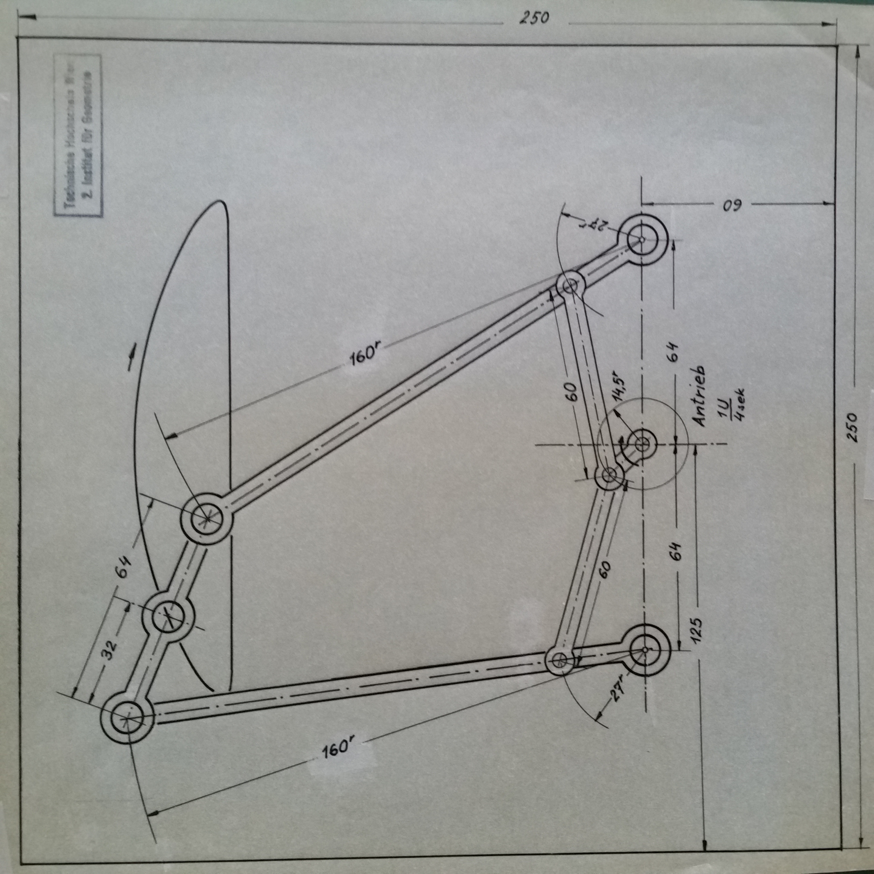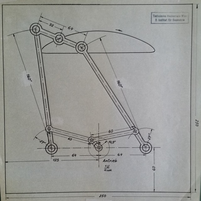 | Angenäherte Geradführung nach TSCHEBYSCHEFF. Antrieb einer Doppelschwinge durch einen Burmesterschen Brennpunktsmechanismus. Ausgestellt im Österreich-Pavillon der Weltausstellung 1967 in Montreal. |