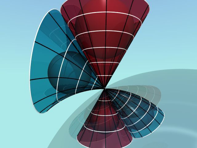 The cyclides of Dupin arise from cones of revolution, cylinders of revolution, and tori under the inversion with respect to a sphere. Any cyclide is a channel surface (envelope of a one-parameter family of spheres) in two different ways. All their curvature lines are circles (or lines). The image shows a cone, its inversive image, some inscribed spheres, and the sphere of inversion.