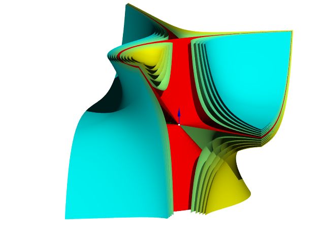 is stationary at the origin, i.e., its gradient at the origin is the zero vector. The image depicts several isosurfaces of F near the origin.